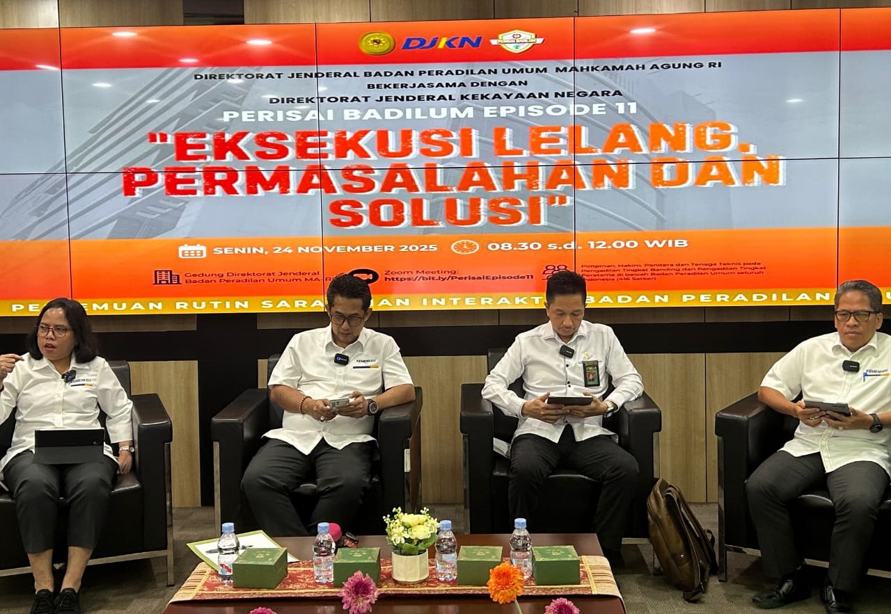 Dalam pemaparannya, para narasumber membahas berbagai aspek penting terkait eksekusi lelang mulai dari proses penilaian objek lelang, ketentuan pelaksanaan lelang, fungsi dan peran strategis lelang dalam sistem keuangan negara, hingga permasalahan yang sering muncul di lapangan, serta solusi implementatif yang dapat diterapkan. Melalui komitmen bersama dalam memperkuat tata kelola eksekusi lelang di Indonesia, Ditjen Badilum dan DJKN Kemenkeu terus meningkatkan koordinasi untuk memastikan pelaksanaan lelang berjalan efektif dan berkeadilan.