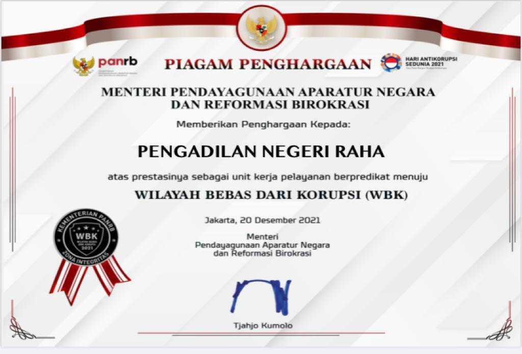Keberhasilan Pengadilan Negeri Raha melakukan perubahan memperoleh ganjaran dari Dirjen Badan Peradilan Umum Mahkamah Agung RI yang menetapkan Pengadilan Negeri Raha sebagai salah satu lembaga peradilan yang terakreditasi dengan predikat "A Excellent". Penghargaan ini menjadi bukti pengakuan meningkatnya kualitas dan makin membaiknya manajemen mutu Pengadilan Negeri Raha. Tak hanya itu, di bawah racikan tangan dingin Bapak Muhammad Sukamto, S.H., M.H., Pengadilan Negeri Raha semakin terlihat lebih baik dan pada tahun 2021 bersama 18 pengadilan negeri lainnya di Indonesia, Pengadilan Negeri Raha kembali berhasil memperoleh penghargaan dari KEMENPAN RB sebagai Unit Kerja Pelayanan Berpredikat Menuju Wilayah Bebas Dari Korupsi (WBK).
