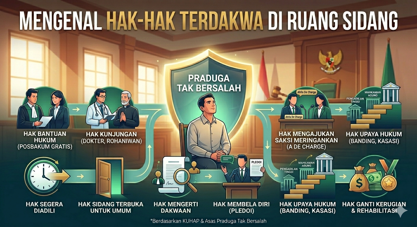 Berikut adalah rincian hak-hak terdakwa di ruang sidang berdasarkan Kitab Undang-Undang Hukum Acara Pidana (KUHAP):